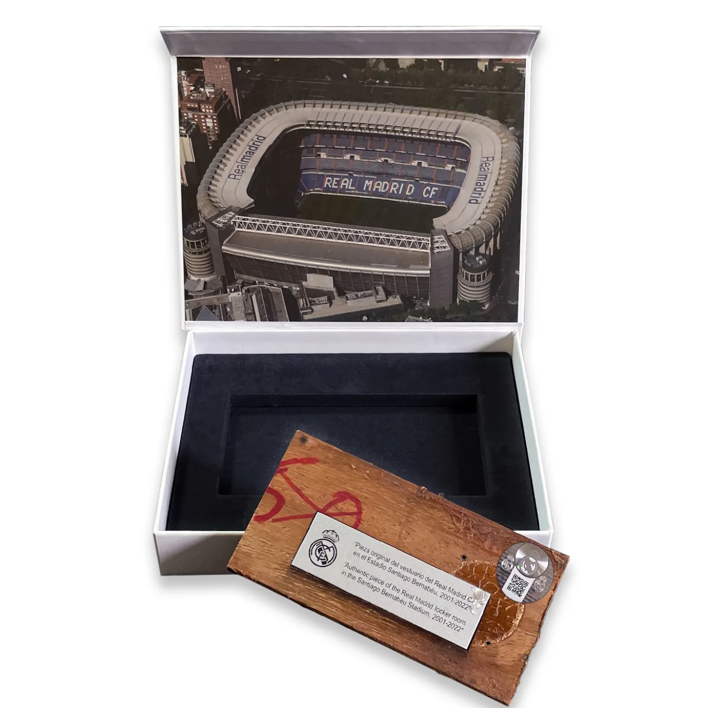 Llévate a casa un «pedazo de historia» del vestuario del emblemático Estadio Santiago Bernabéu, utilizado exclusivamente por el primer equipo. Esta pieza de edición limitada ha sido testigo de algunos de los momentos más importantes en la historia del Real Madrid CF, incluyendo épicas victorias contra los mejores equipos del mundo.