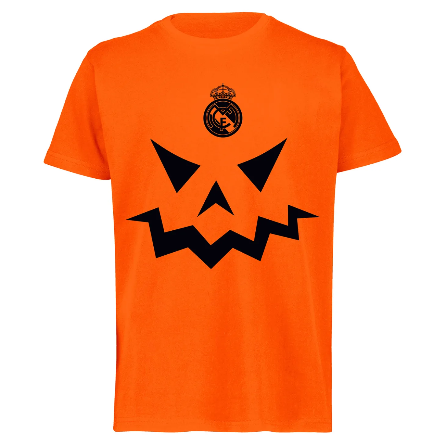¿Truco o Trato? Este Halloween el miedo se viste del Real Madrid con esta camiseta de halloween para niños en naranja. Con el diseño del escudo del Real Madrid sobre una «cara de calabaza» en la parte frontal, esta camiseta es perfecta para la noche más terrorífica del año.