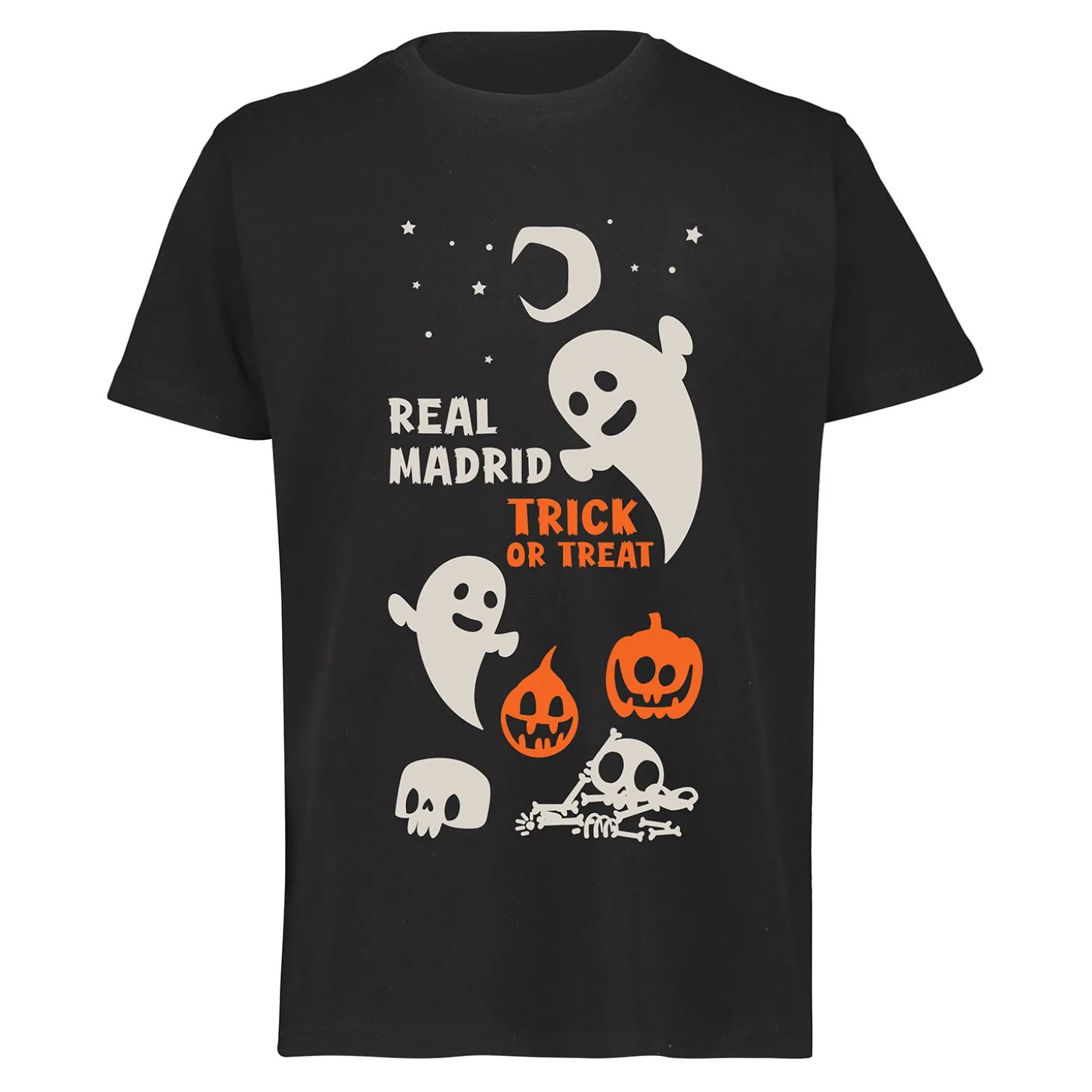 ¿Truco o Trato? Este Halloween el miedo se viste del Real Madrid con esta camiseta de halloween para niños en negro. Con el diseño Real Madrid «Trick or Treat» que cuenta con elementos distintivos de Halloween en la parte frontal, esta camiseta es perfecta para la noche más terrorífica del año.